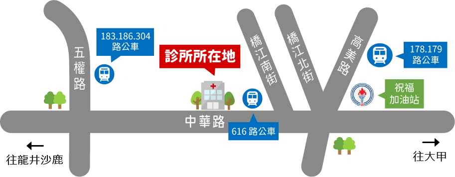 - 616路公車:中華高美路口,步行至診所約1分鐘。